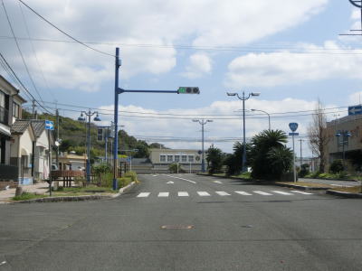 | 内陸部へ向かうと同時に上り勾配となり、緩やかな右カーブの先で下りに転ずる。直線道路を下っていると海の手前で長崎r34地域センター前交差点に突き当たり、左折して樺島・脇岬方面に進む。 | ||