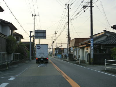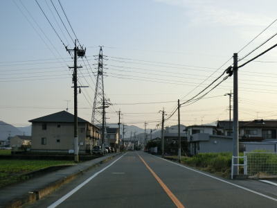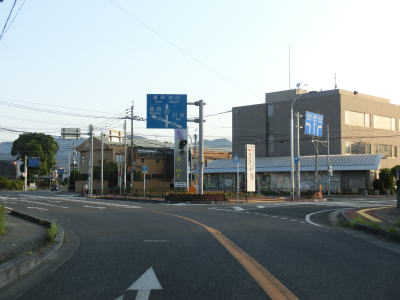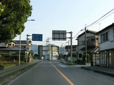 | 福岡r132十文字交差点を過ぎた先の右カーブ辺りからは大刀洗町と小郡市、筑前町の境が交錯する場所を通っており、三度目の小郡市に入って境付近を走っていると筑前町に入り、大刀洗橋から大刀洗町に戻り、100mで再び筑前町に入る。東端の境にのみ境標識が設置されているが、筑前町のものはなく大刀洗町だけである。 筑前町に入ってから約1.5kmで朝倉市に入るが、ここには筑前町の境標識は立っているが、朝倉市のそれは未設置である。おにぎり下の「朝倉市」という補助標識が市境標識の替わりをしている。 |