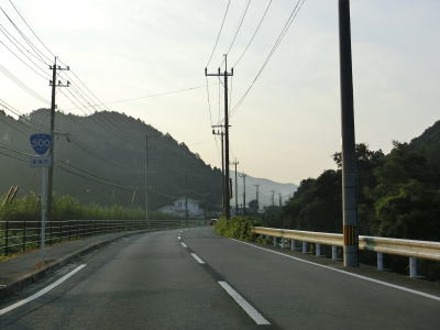 | 勾配がほとんど感じられない1.8車線幅道路を走る。百丁原橋を渡って小石原川の左岸を少し走った後に川から離れて行く。右カーブを曲がった先でR211吉ノ浦橋交差点に突き当たる。案内標識にR500のおにぎりが表記されていないが、右折して日田・宝珠山方面に進む。 | ||