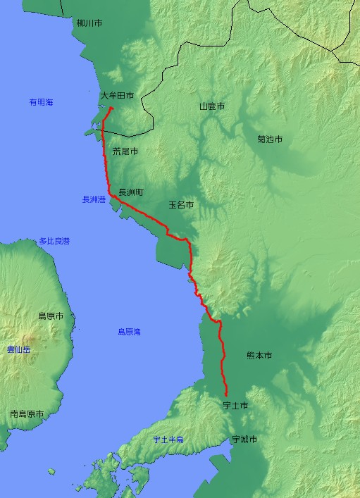 | 主な経由地 | 福岡県大牟田市〜 〜熊本県荒尾市〜長洲町〜玉名市〜熊本市〜宇土市 |