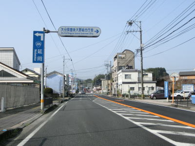 | 引き続き緒方川の左岸を走っていると大分r634交差点と大分r210馬場交差点を相次いで通過する。馬場交差点を右折してr210を走ると緒方駅に行く事ができる。さらに川沿いを走ると緒方支所入口交差点を通過する。交差点の名称が示す通り豊後大野市役所緒方支所の出入口に当たる交差点であり、この辺りが旧緒方町の中心部だったのだろう。町役場にも駅にも近い場所だが、市街地と言うほど家屋が集まっていないのは現在のR502がバイパスとして造られたルートのためだろう。 | ||