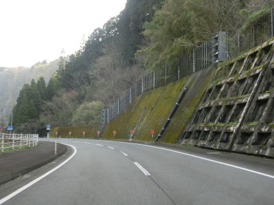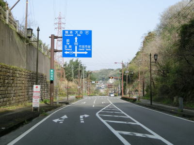 | 三重原交差点からはR326との重複区間を竹田方面に向かって走る。ごく普通の対面2車線道路だが、豊後大野市の中心部に近い事もあって交通量は少なくない。拡幅工事が計画されているようで立ち退き等で道路用地が確保されている場所も確認できた。S字状にカーブしながら緩やかな勾配を下る。 | ||