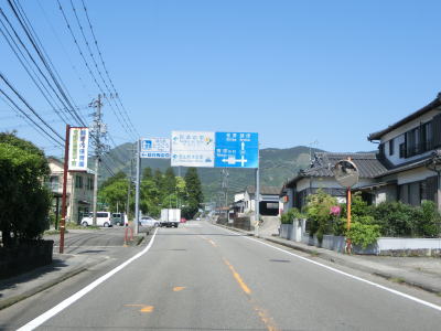 | 花水流交差点を過ぎて花水流集落を走っていると左の急カーブを曲がる。カーブの途中には町道105号が接続しており、原良橋を渡ると耳川の対岸に行く事ができる。町道との交差点からは集落が途切れているが、道路状況は走りやすい2車線道路が維持されている。西郷発電所のすぐ近くでR327・R388交差点を緩やかな右カーブを描きながら通過する。ここからはR388も重複しており、2区間目の3国道重複状態となる。 | ||