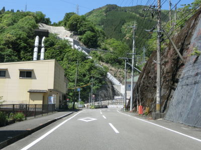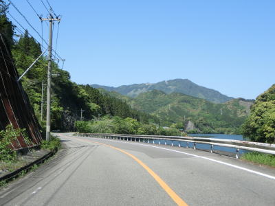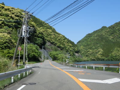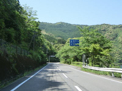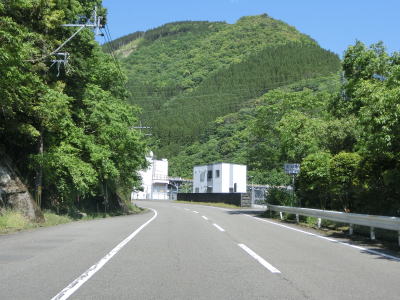 | 諸塚村に入ってからも耳川沿いの2車線快走路が続いており、交通量も非常に少ない状態である。左にカーブしている諸塚トンネルを出た直後に山須原ダムの北側を通過する。ここで貯められた水が山須原発電所まで引き込まれて発電に使われている。 | ||