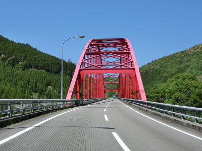 | 諸塚村に入ってから約4.7kmで赤い塗装が目立つ夢の大橋を渡る。しばらく耳川の右岸を走った後に虹の大橋を渡って左岸に戻る。この夢の大橋と虹の大橋はそれぞれ町村境を越えており、2つの橋の間の約800mの区間は美郷町に属している。道路沿いに集落は存在しないが、接続する林道へ進めば集落が点在している。 | ||