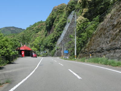 | 虹の大橋を渡って耳川に沿って右にカーブすると古川集落を通過する。沿線にある建物は少ないが諸塚村(と言うより宮崎県の山間部)では貴重な廃業していないガソリンスタンドがある。その後も耳川に沿って2車線道路を走る。川が町村境のため対岸は美郷町域である。 | ||