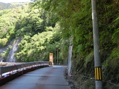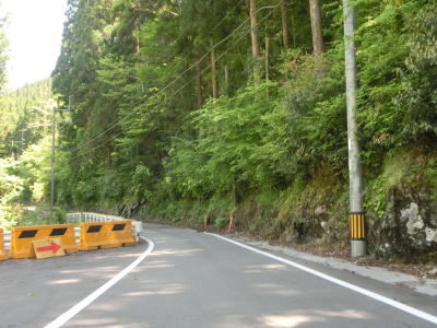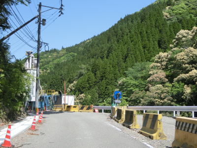 | 宮の元ダムの手前でセンターラインがなくなって狭路となるが、走行当時は拡幅工事が行われていた。工事現場は1.0車線幅となっているが、元々の道幅が狭いせいか交通量が少ないせいか交互通行規制は行われていなかった。宮の元ダムの脇を過ぎると道幅が広くなる。 | ||