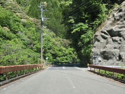 | 緩やかな上り勾配の狭路を走っていると長野谷林道との交差点を通過する。カーブの先にあるため分かりにくいが、左の橋が渡る方が国道である。只石バス停付近はセンターライン付きの2車線道路だがすぐに狭くなる。 | ||