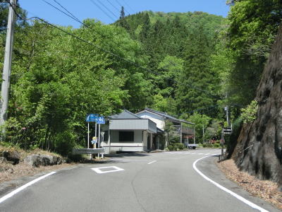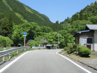 | 北枌バス停付近の2車線区間が終わると1.0車線狭路を走らなければならないがその距離もさほど長くない。センターライン付きの2車線道路を走っていると井戸集落と七ッ山集落に向かう町道との交差点を通過する。交差点の傍に物産店のような小さな建物が見えるが、これはコインランドリーである(駐車スペースと自販機があるのでちょっとした休憩くらいはできる)。 | ||