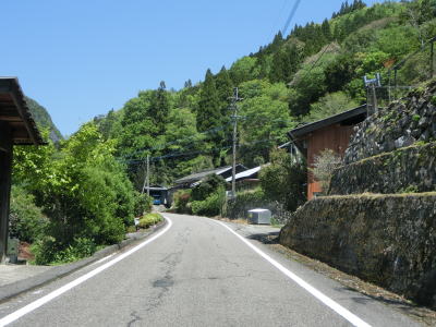 | 只石集落からは1.0車線幅の割合が増えるとともに路面状況が悪くなる。幸重谷をヘアピンカーブで通過して七ツ山川沿いをさらに進むと飯干集落に入る。峠と同じ名称の集落である事からも想像できるが、諸塚村側の最後の集落である。 | ||