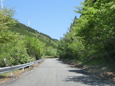 | 七ツ山川の源流付近からは景色が開けるようになり、五ケ瀬町との境の尾根筋に風力発電用の風車が複数建っているのが確認できる。飯干峠の南の尾根に8基の風車が並んでいる。時折風車を視界に入れながら峠に向かってカーブの多い1.5車線道路を上って行く。右、左とヘアピンカーブを曲がってさらに標高を上げる。2ヶ所目の左ヘアピンカーブの内側には駐車スペースが設置されている。 | ||