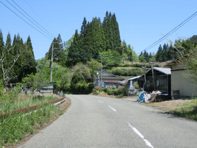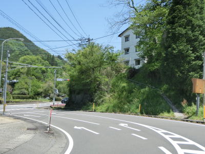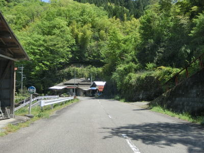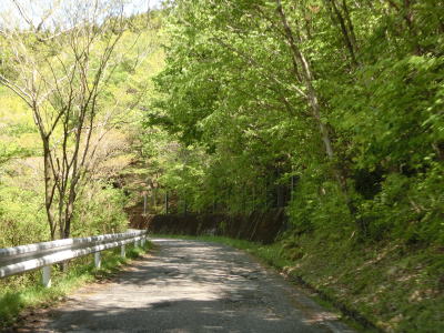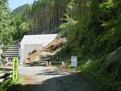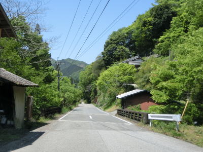 | 峠から2.3km程でヘアピンカーブの連続状態が幾分か落ち着く。ヘアピンカーブの数が多いせいか勾配は比較的緩やかである。最初の集落の手前で土石流対策工事が行われており、その真ん前で最後のヘアピンカーブを曲がる。峠からの距離は約3.9kmで標高は760m程度である。比高が約240mなので平均勾配は6%である。直線距離が1.4kmなのでその場合の勾配は17%と、ヘアピンカーブのおかげでかなり勾配が緩やかになっているのが分かる。 | ||