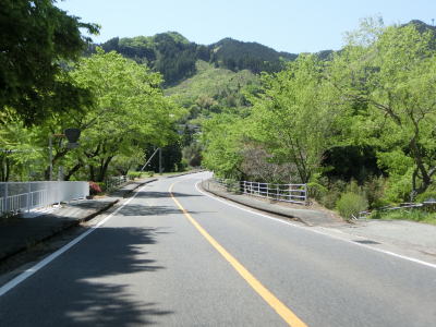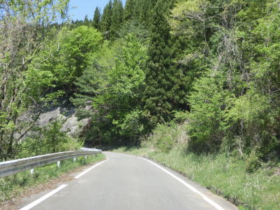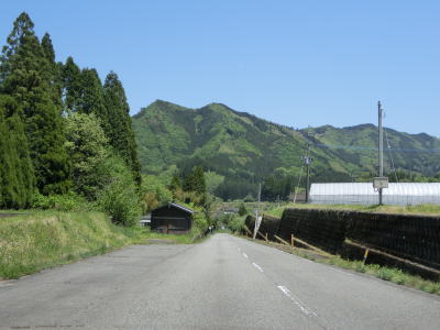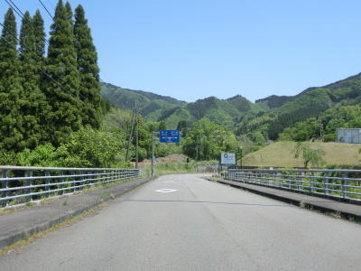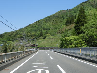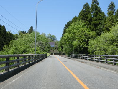 | 一直線ながらやや急な勾配を下った後に三ヶ所川を2ヶ所続けて渡る。橋の前後にアップダウンがあるが緩やかなので走行に支障はない。板狩橋を渡って左カーブを曲がっていた板狩集落を通り抜ける。 | ||