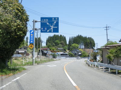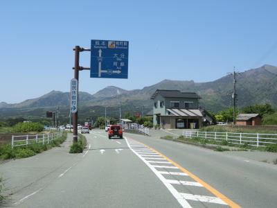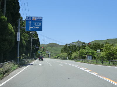 | 登坂車線が終わって勾配が緩やかになった所でR218・R265・R327馬見原交差点を直進する。起点の新生町交差点から家代交差点までの約47kmに渡って重複していたR327の終点がこの交差点であり2ヶ所目の重複区間とはならない。 馬見原交差点からはR218・R265・R503との3国道重複区間となる。蘇陽橋を渡って勾配を上っているとR218・R265滝上交差点に至り、右折してR265との重複区間を南阿蘇・高森方面に進む。この交差点の案内標識にもR503のおにぎりは表記されていない。 |