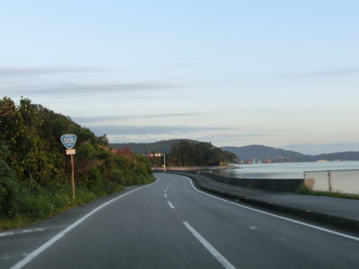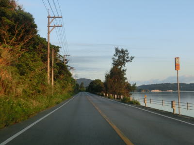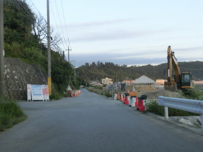 | 仲尾次北交差点から程なくして海岸線に沿って走るようになる。海の向こう側には屋我地島があり、その島と本島に挟まれた場所は羽地内海と呼ばれている。仲尾次北交差点から約1.9km走るとセンターラインがなくなり1.5車線幅と狭くなってしまう。走行時はその狭い区間において法面の崩落の復旧工事が行われている関係で、特大車は終日通行止で工事の最中は全車両が通行止という規制が敷かれていた。今回通過できたのは工事が始まる前の時間に走行したためである。 | ||