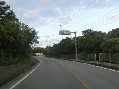 | 沖縄r248交差点の北に沖縄電力の今帰仁変電所があるが、その前には冠水に注意を促す看板が立っていた。前方に量水標があるとも書いてあったが、凹部がどこかも分からず量水標も見つけられなかった。 今帰仁村の中心部の手前には急カーブを含む下り勾配を走る。平坦になった所で沖縄r72との交差点を通過する。大井川を渡るとr72との2ヶ所目の交差点を通過し、左にカーブしながら今帰仁村の中心部と言える場所を走り抜ける。 |