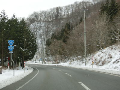 | 栗畑二の橋を渡って左カーブを曲がって栗畑一の橋を渡った先のR340落合交差点を左折して龍泉洞・岩泉方面に進む。直進のR340茂市方面は宮古市との境の雄鹿戸トンネルを挟む区間が狭路酷道だったが、押角トンネルが開通して道路状況が大幅に改善されている(それでもまだ狭路区間が残っている)。 | ||