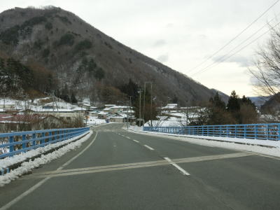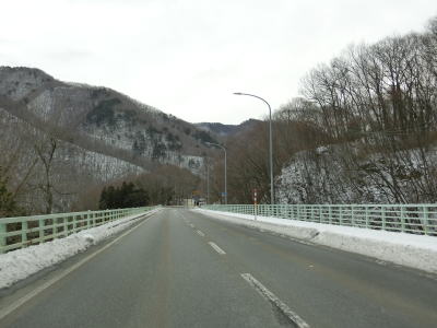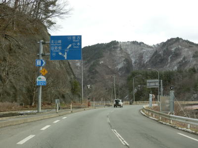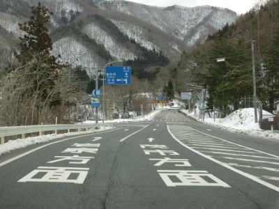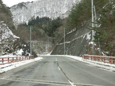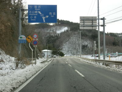 | 新石畑橋を渡った先で旧道と思われる町道との交差点を通過するが、この町道には八戸川内大規模林道が重複している。石畑集落を通り抜け、蛇行する小本川の左岸をカーブの少ない2車線道路で走り抜ける。八戸川内大規模林道が分岐した後に右岸に移る。新袰綿橋の手前に道の駅「いわいずみ」の案内標識が設置されているが、道の駅までの距離は21kmもある。2.1kmではなく21kmである。 | ||