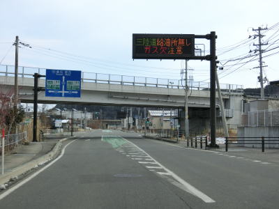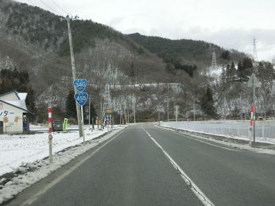 | 三陸鉄道リアス線をくぐって少し走るとR45・岩手r291小本交差点に至る。この交差点がR455の終点である。R45宮古方面からR455の左折は専用の車線が設置されているため、信号機の色に関係なく左折可能である。おそらく岩泉龍泉洞ICの供用に際して整備されたと思われる。 | ||
