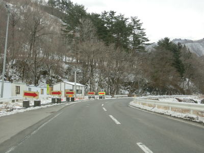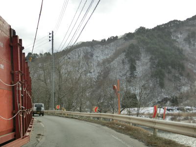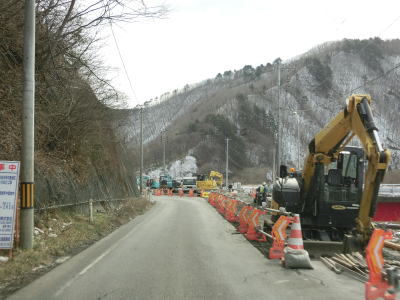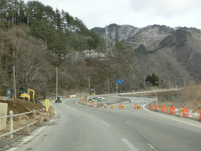 | 町道の中里橋の北詰付近でも道路工事が行われていた。採石プラントの川寄りにバイパスを通すようで林ノ下集落の手前の接続地点も片側交互通行規制が敷かれていた。林ノ下集落からは堤防上の2車線道路となり線形も見通しも良い快走路となる。 | ||