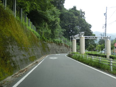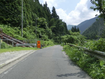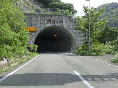 | ごく緩やかな勾配の狭路を走っていると突然センターラインが現れて達原トンネルをくぐる。川沿いを走っている道路が旧道だろうが、1.0車線の狭路の大半に雑草が生えており車で進入しようとは思えない状態である。西側の旧道口では見えなかったが、東側にはチェーンゲートで閉鎖されている。トンネルを出た所に家屋数軒程度の海集落があるが、異常気象時通行規制区間はこの集落までとなっている。 | ||