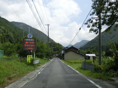 | 上矢作小学校を通過すると一旦集落が途切れて上村川沿いを走る。程なくして集落に入るが道幅は1.0車線幅と狭い。集落の中ほどで異常気象時通行規制を示す標識が置かれており、それによると連続雨量60mm以上で通行注意、連続雨量80mm以上で通行止、時間雨量30mm以上で通行止になるとのこと。標識から少し進むと狭い道幅には不釣り合いに思える電光掲示板が設置されている。奥にも家屋があるため閉鎖ゲートが設置されていないが、雨量規制時にはこの電光掲示板の場所で通行止になると思われる。 | ||