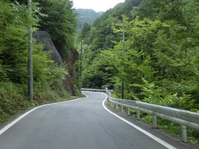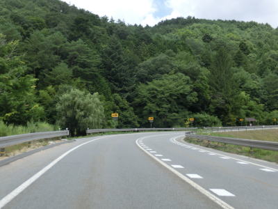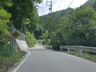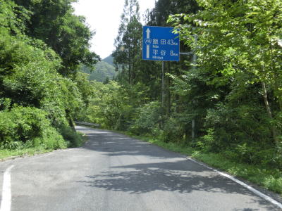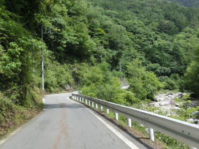 | 短い2車線区間が終わると再び1.5車線幅となるが、蛇行する平谷川に沿ってカーブの多い狭路を走る。程なくして再びセンターラインが現る。消えかけているとは言え2回目の2車線区間は短距離では終わらない。 | ||