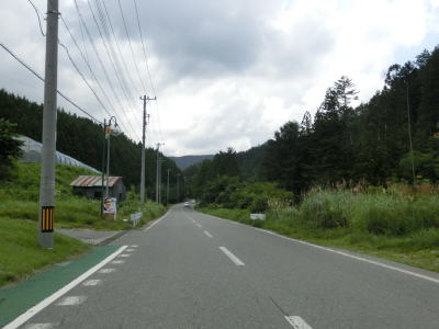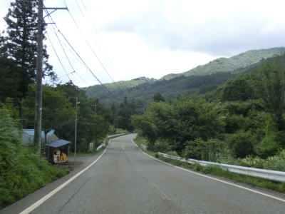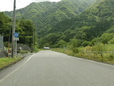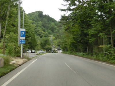| 平谷交差点を通過してからも上り勾配が続いている。中心部と言える範囲を出ると道路沿いの家屋の数が少なくなり、さらに進むと家屋が途切れる。入川に沿って上り勾配の2車線道路を走っていると「駐車帯 仮眠場」の前を通過するが、蕎麦屋が隣接しており店の駐車場だけでは車が収まらず駐車帯にまで停められていた。 | ||