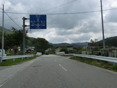 | 長野r447交差点からは歩道のない2車線道路となる。家屋の間を走っていると売木川に架かる前川橋を渡り、そのすぐ先で左にカーブした直後にR418の売木バイパスとの十字形状の交差点に至る。左折の平谷方面に進むと戻る方向なので、ここは右折して新野方面に進む。 | ||