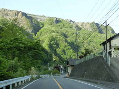 | 神流川の左岸を走っていると魚尾トンネルをくぐる。トンネルの前後で交差し、川に沿っている道路が旧道である。中郷集落で正面に断崖のようなものが見えるが、これは叶山鉱山である。鉱山と言っても産出するのは石灰であり、山そのものが削られている。 | ||